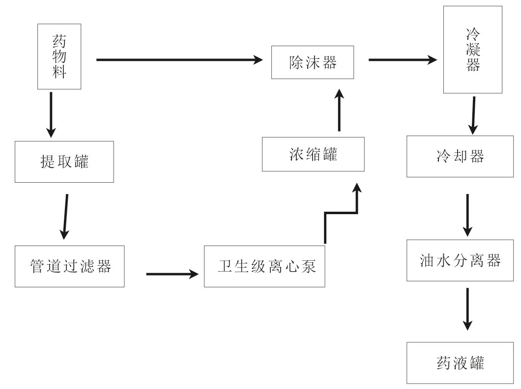 后至過(guò)濾器,進(jìn)入濃縮器。濃縮時(shí)產(chǎn)生蒸汽進(jìn)入冷凝器,成為冷凝液,作為新溶劑噴淋至提取罐同;提取罐內(nèi)產(chǎn)生的二次蒸汽,經(jīng)冷凝器冷
